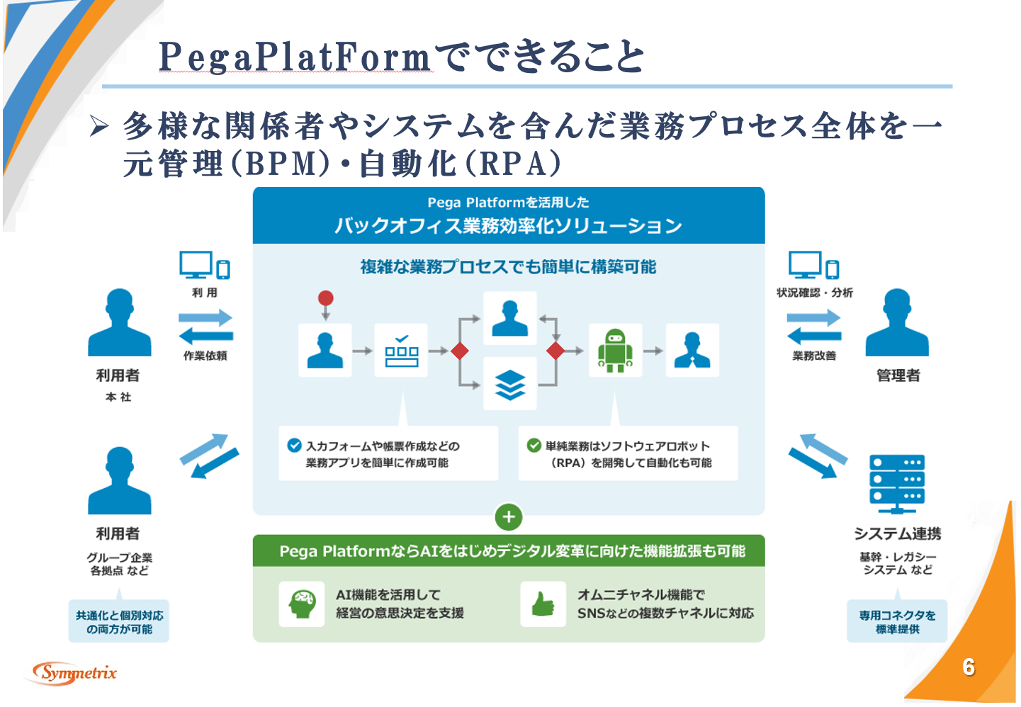 今回の講義では、Pega Platformの構成や開発手法を概観し、業務改善、管理手法の一つであるBPM(Business Process Management)の主な機能を確認しました。後半、「住宅ローン申請」を事例として初期的な要件フロー図を取り上げています。